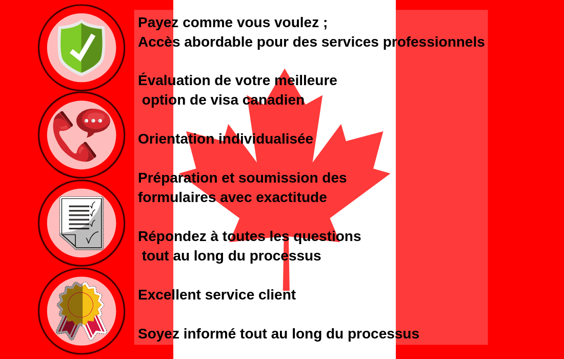 Vous avez la possibilité de faire le processus de demande par vous-même ou avec l’assistance d’un représentant légalement autorisé. La moindre erreur dans la demande peut être une raison suffisante pour être refusé. Lorsque vous choisissez Canada Immigration Express, vous avez la satisfaction de savoir que votre demande est traitée correctement, du début à la fin.